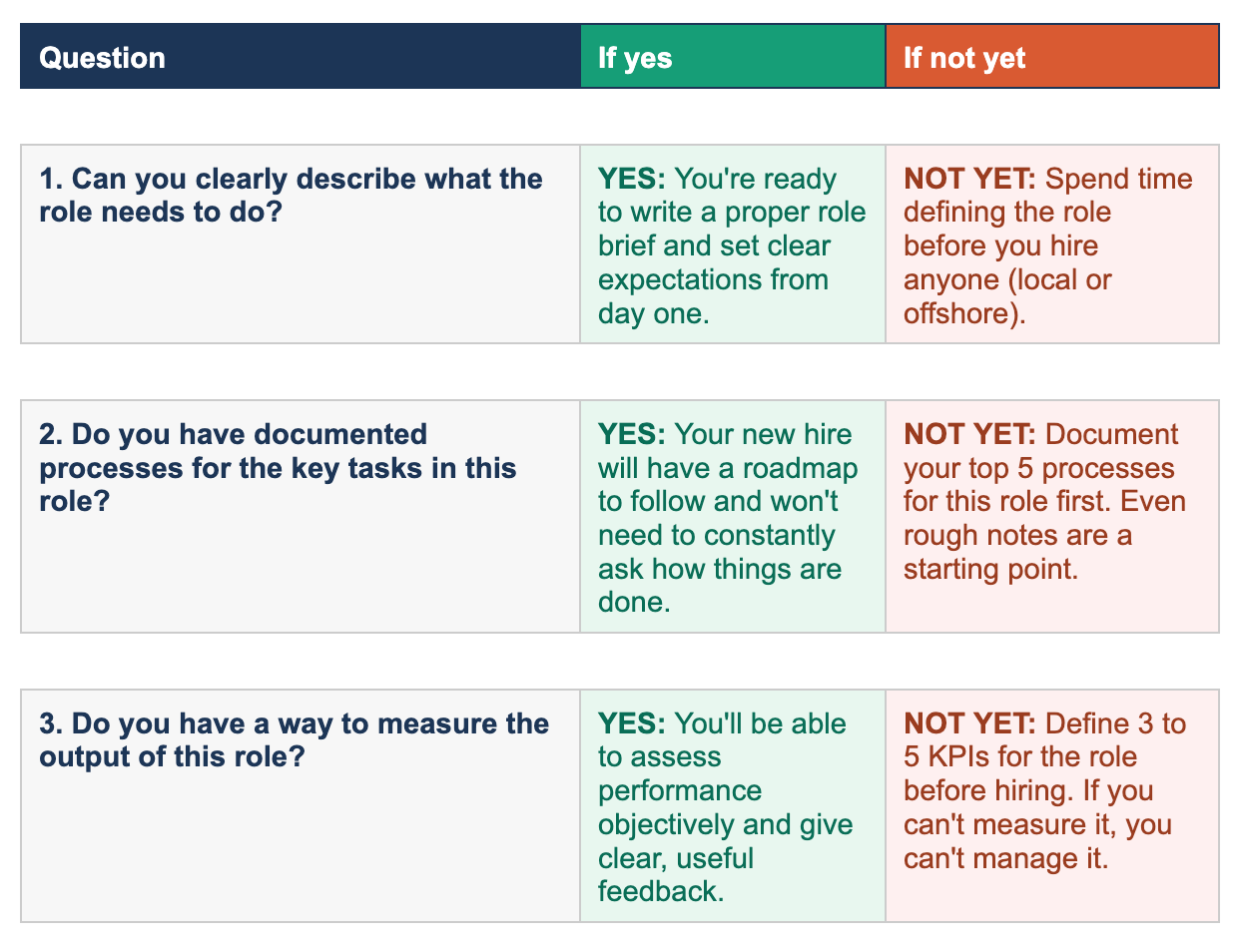 Here's something worth knowing. The work you do to prepare for an offshore hire (documenting processes, defining roles, setting up measurement) makes your entire business run better, regardless of the outcome.